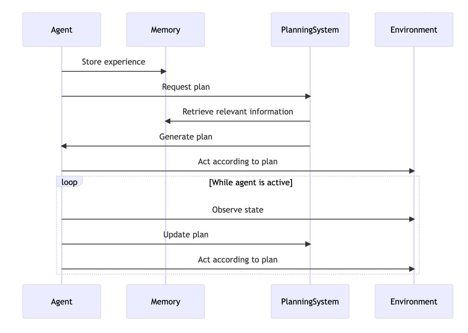 A planning system: The planning system uses the information in the memory system to generate plans for the agent's future behavior. The planning system is able to take into account the agent's goals, the current state of the world, and the potential consequences of its actions.